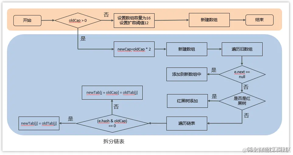 如果是链表,则需要遍历链表,可能需要拆分链表,判断(e.hash & oldCap)是否为0,该元素的位置要么停留在原始位置,要么移动到原始位置+增加的数组大小这个位置上