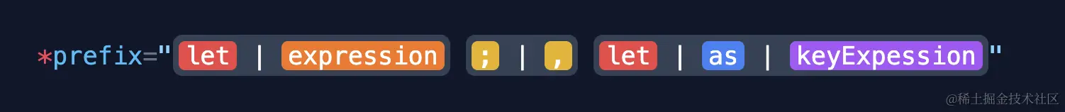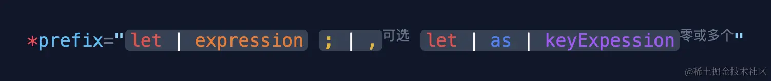 看起来与 *ngFor 的书写方式有些相似,但这种写法也是完全符合微语法的语法规则的。根据我们之前学到的知识,要理解它也是比较容易的: