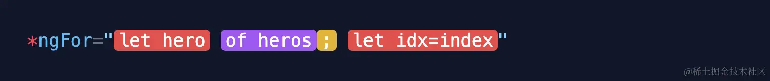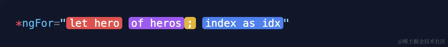 let 关键字用于声明模板输入变量,我们可以在模板中引用这个变量。在这个例子中,输入变量就是 hero 和 idx,微语法解析器会把let hero 和 let idx 翻译成 <ng-template> 上的模板输入变量: