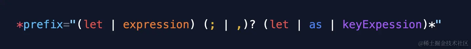 *:prefix="( :let | :expression ) (';' | ',')? ( :let | :as | :keyExp )*"