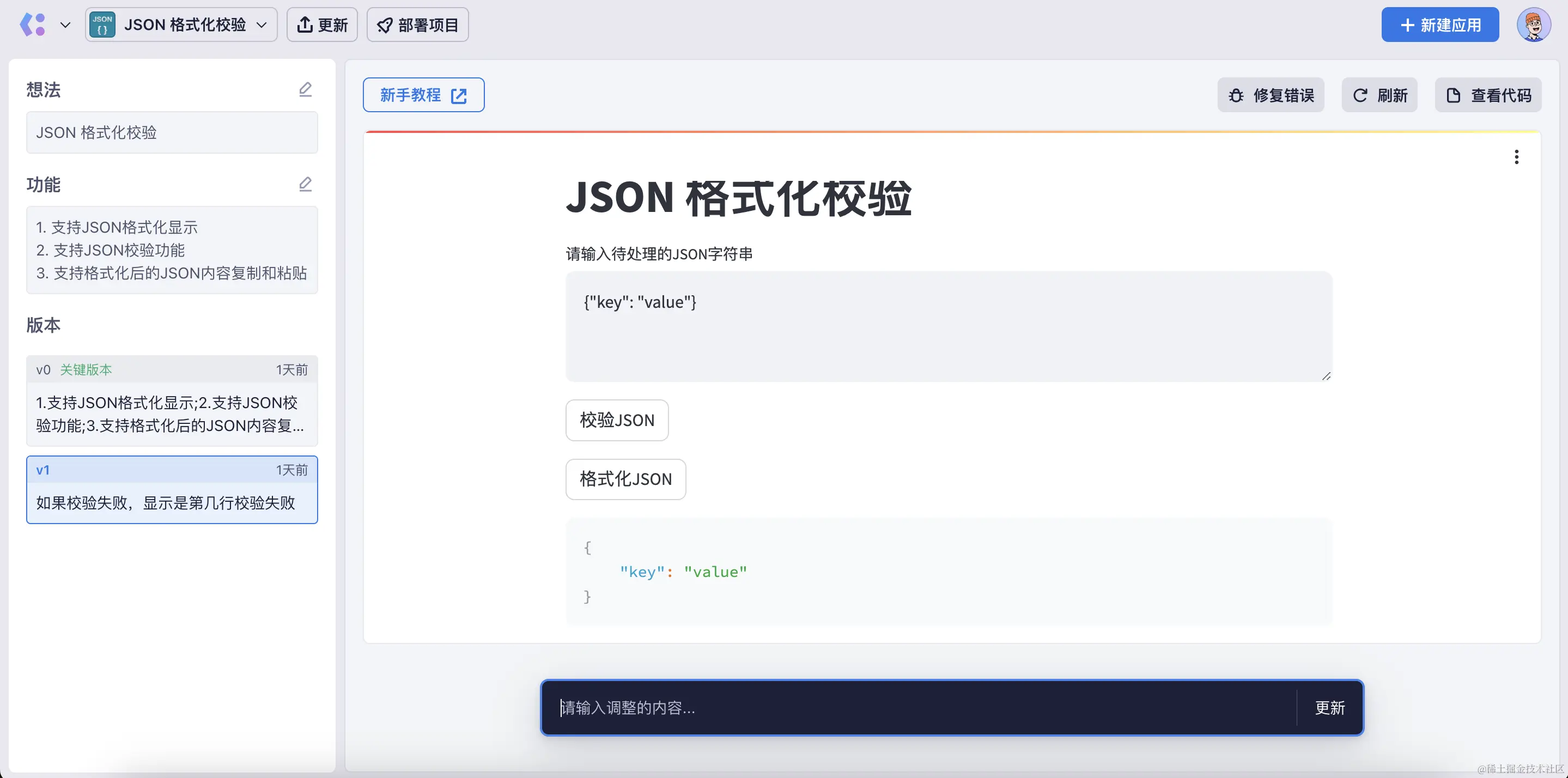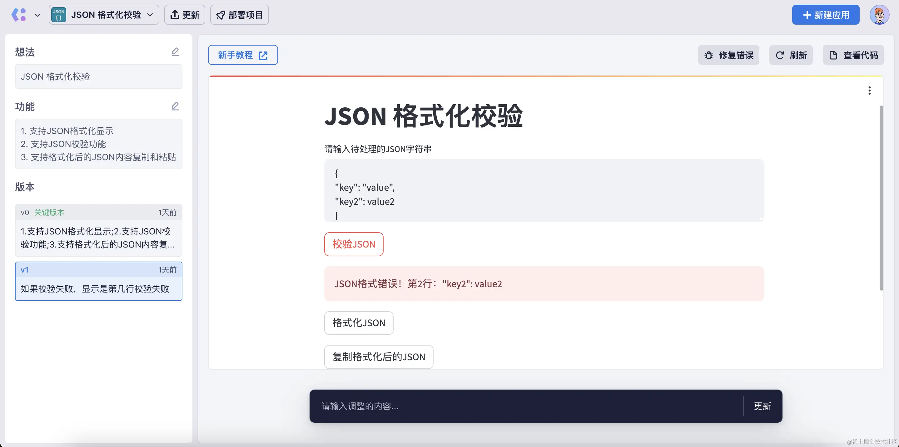 左侧的版本列表中,v1 就是完善的功能,因为初始版本 v0 生成后,发现如果粘贴的 JSON 格式错误,会导致报错,所以就用自然语言跟 AI 说:“如果校验失败,显示是第几行校验失败”。然后应用就更新了,这样如果输入的 JSON 字符串有格式错误,会提示出来,比如: