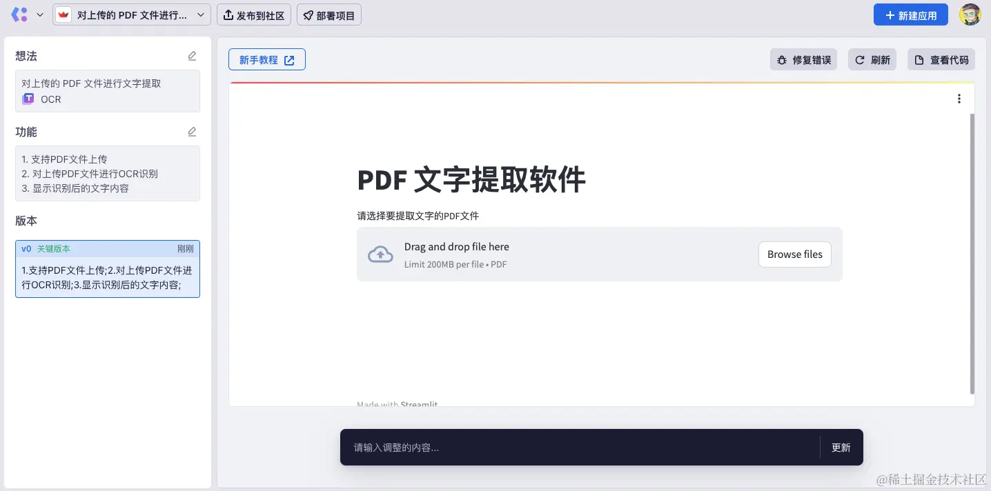 想法:对上传的 PDF 文件进行文字提取,并使用 AI 能力对提取的文字进行归纳总结。