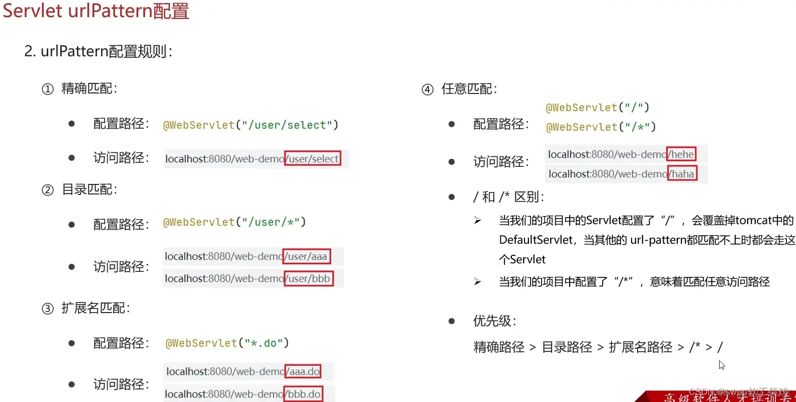 ①②:访问 /user/select 会访问 精确匹配 而不是 目录匹配 ; ④: /* 优先级>/ 尽量不用④