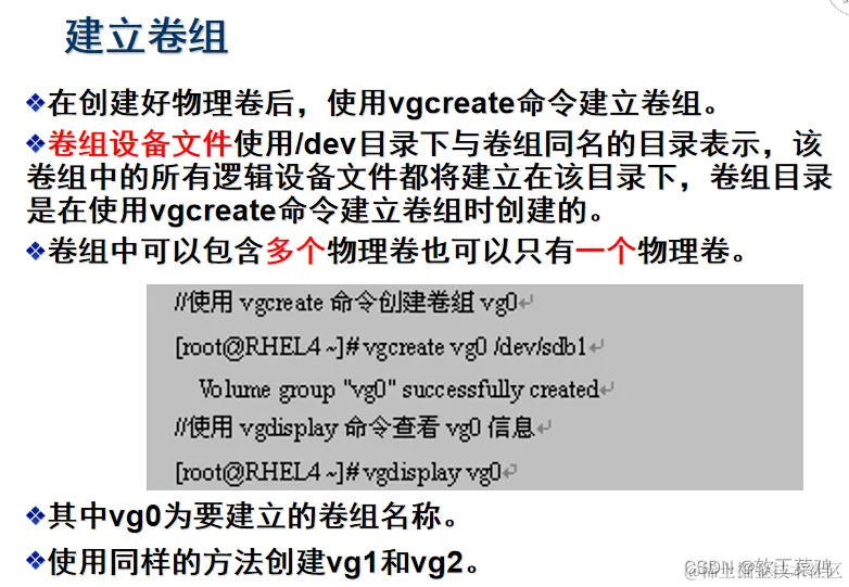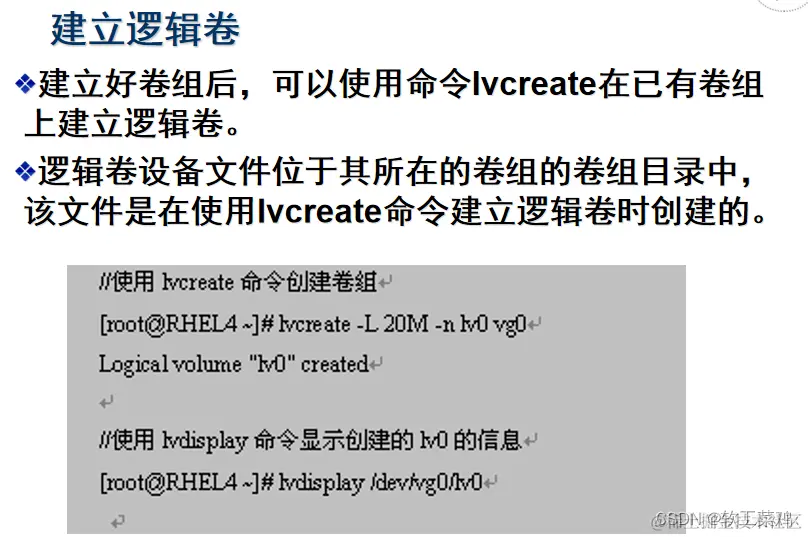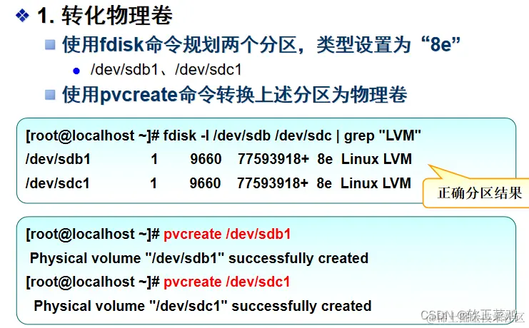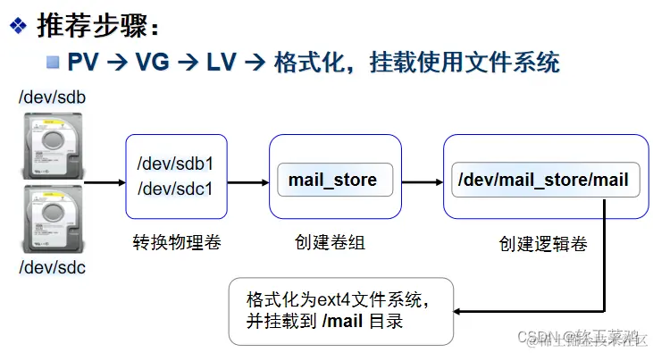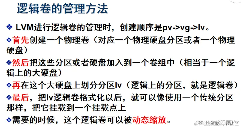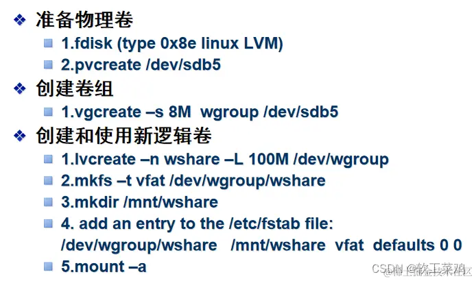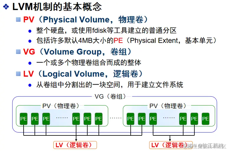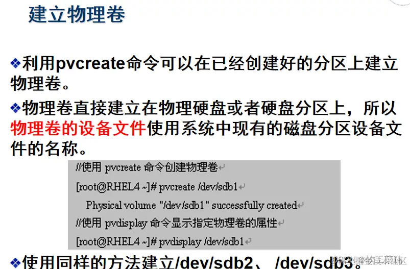 重点说明创建LVM文件系统的基本过程(3个步骤):先PV,再VG,最后LV: