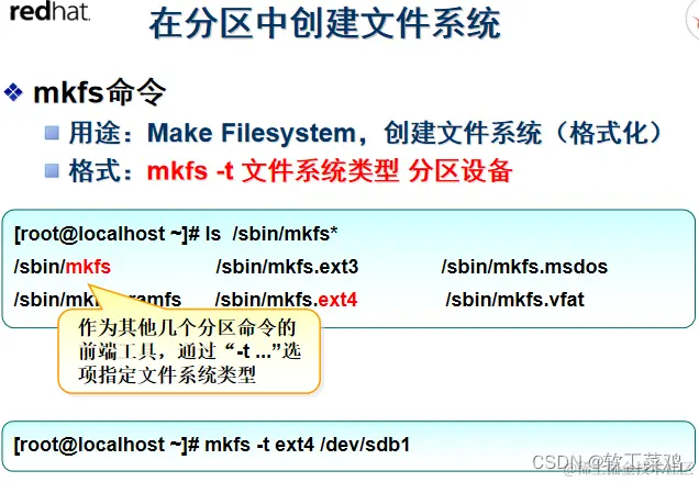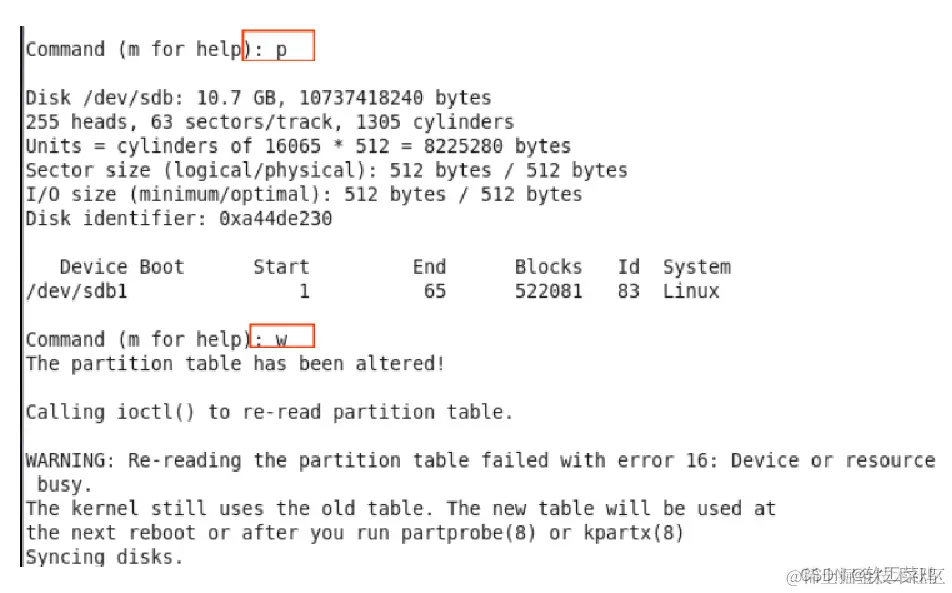 使用fdisk命令分区以后,应执行“partprobe”命令重新检测分区表,或者重新启动系统
