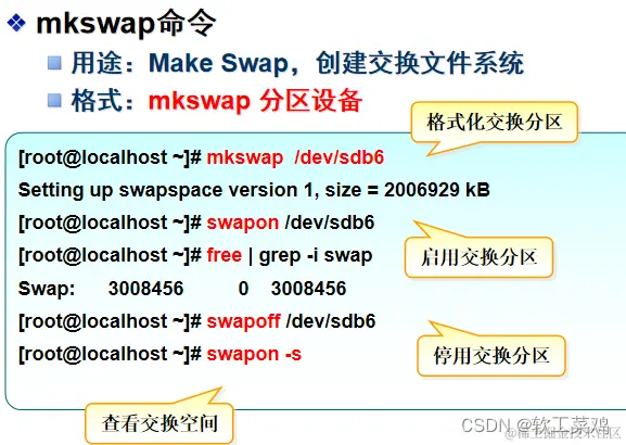 交换分区空间的启用、停用需要使用swapon、swapoff命令,free命令可以查看物理内存、交换空间的使用情况