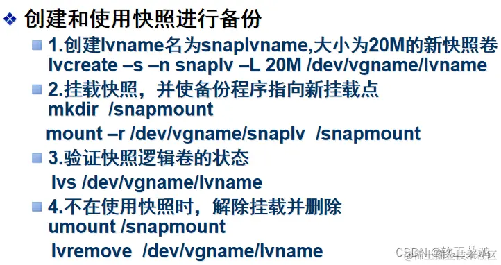 1、硬盘;2、分区,格式8e;3、创建pv,如果提示分区找不到,partprobe /dev/sdb;4、创建vg,vg1;5、创建lv, lvcreate -L 400M -n mymail /dev/vg1;6、格式化lv;7、mount;8、建立文件或拷贝文件,模拟数据产生;9、建立快照,和逻辑卷一样大,增量备份;10、恢复数据,先umount,lvconvert --merge