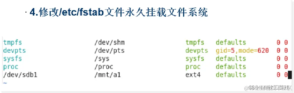分别介绍配置记录中6个字段的含义,重点强调前3个字段(决定挂载的关键部分),后面的3个字段简单介绍即可