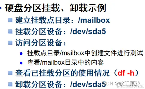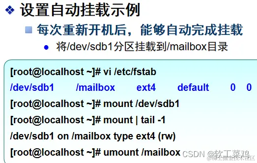 在/etc/fstab文件中正确设置了相应分区的自动挂载记录以后,手动挂载、卸载该分区时,仅需指定设备名、挂载点中的任意一个作为参数即可,例如,执行“mount /dev/sdb1”或者“umount /mailbox”都可以完成卸载