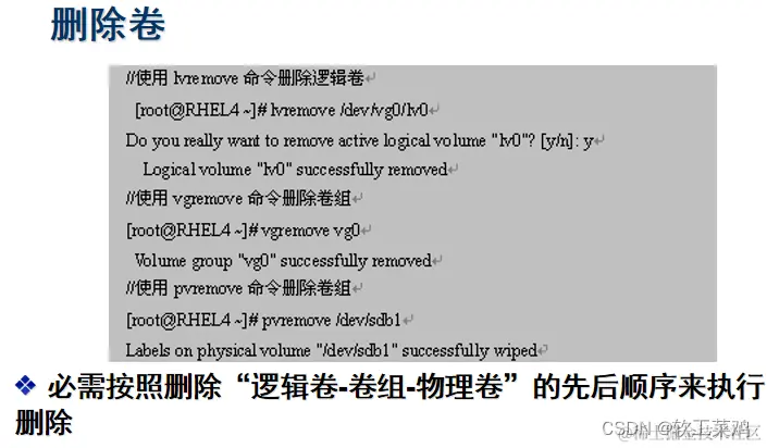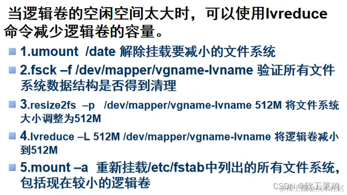 强调:不建议对逻辑卷进行缩减容量操作,因为这非常容易造成现有数据的损坏(通常不得不重新格式化文件系统),若确实需要减少逻辑卷容量时,可以使用lvreduce命令,按“y”确认后可以减少磁盘容量。例如: