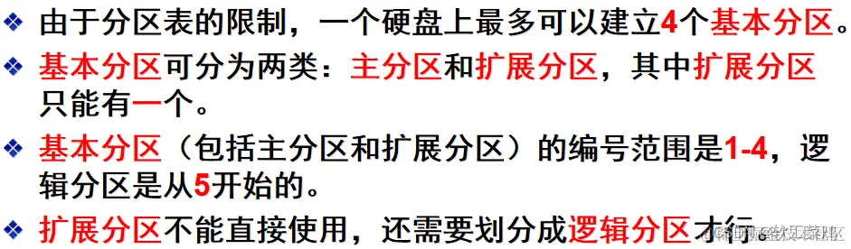 3. 扩展分区只用于容纳逻辑分区,并不建立文件系统,因此也不能直接向扩展分区中保存文件和目录