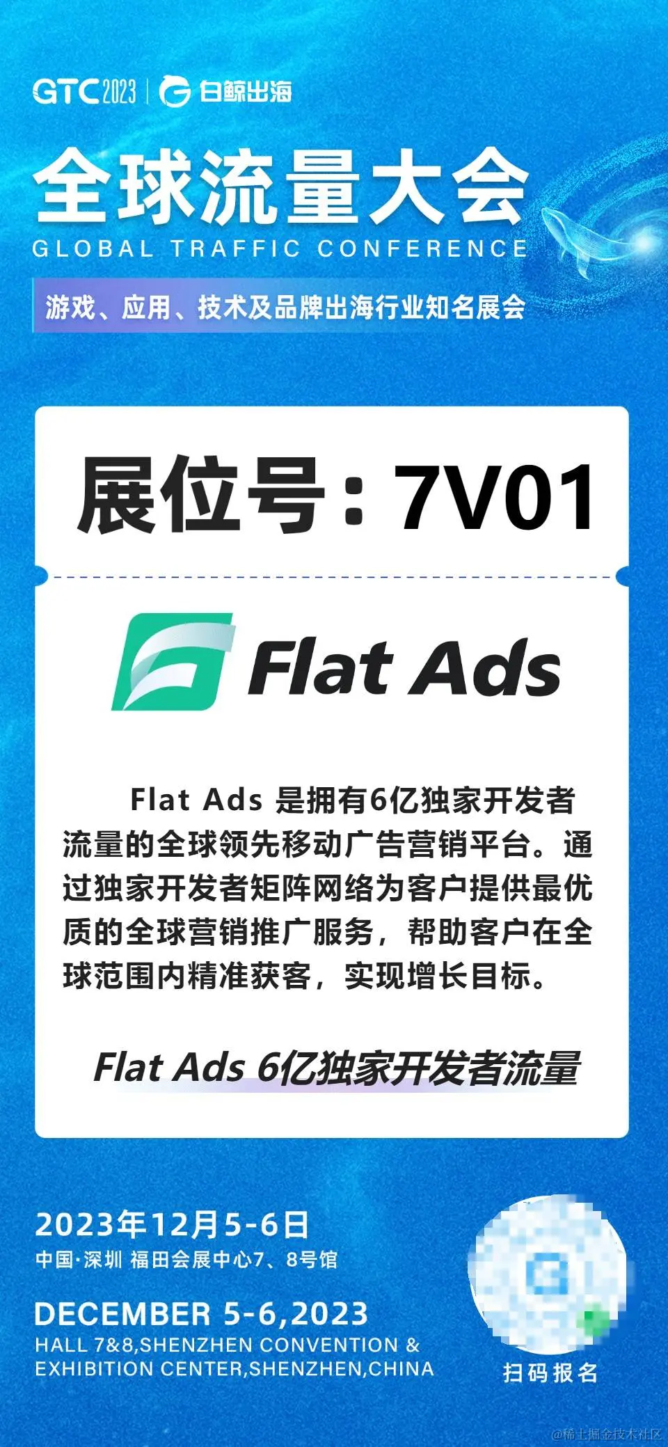 作为全球领先的移动广告营销平台,Flat Ads深耕海外广告营销行业,也受邀将出席本次大会。若您有用户增长或广告变现的需求,欢迎在公众号【Flat Ads】后台私信我们与商务专业团队提前预约洽谈,或活动期间直接前来Flat Ads展位7V01进行咨询与交流,展位信息如下: