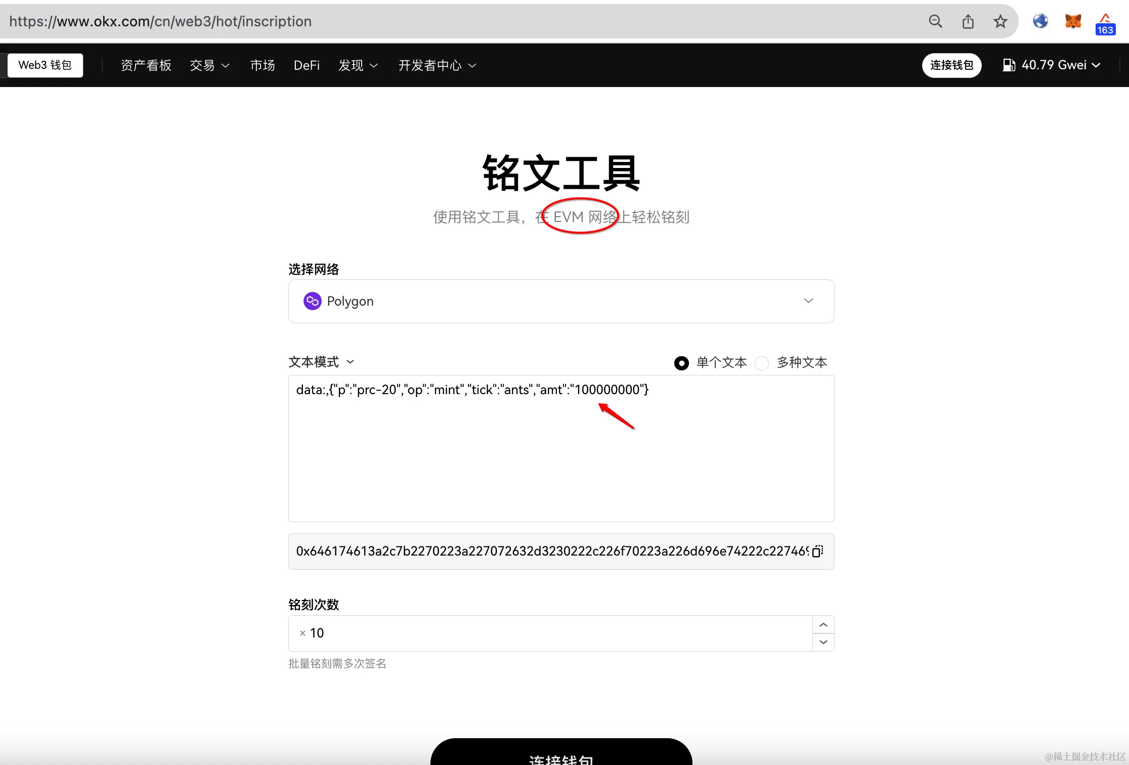 'data':'0x646174613a2c7b2270223a227072632d3230222c226f70223a226d696e74222c227469636b223a22616e7473222c22616d74223a22313030303030303030227d', # mint16进制