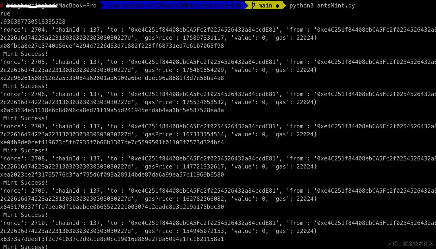 记得先替换程序开头的private_key和address两个为你自己的钱包。钱包申请方法使用文章末尾OKX Web3钱包。然后,打开终端,执行 python3 antsMint.py命令开始打铭文: