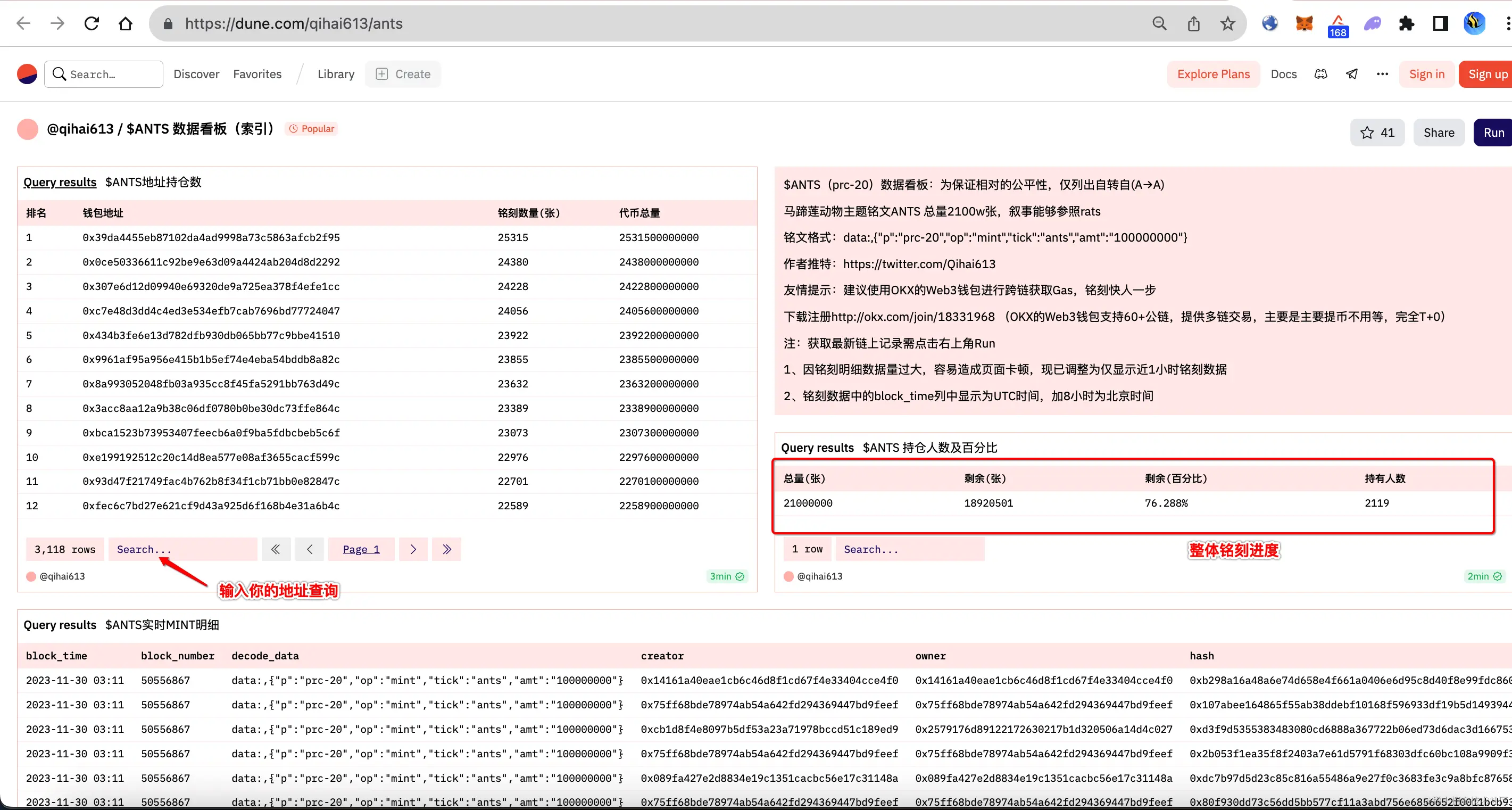 通过社区dune面板可以查看当前铭文打的总体进度,可以输入你的wallet address,查看自己打了多少张。