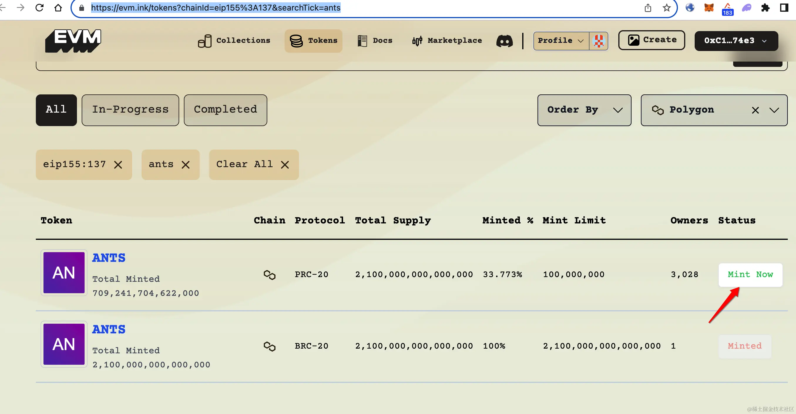 Polygon马蹄链动物主题铭文$ANTS 总量2100w张,当前还剩余76%,成本很低0.003MATIC一张,可以打了防身。 BRC20比特币铭文生态有RATS老鼠大军,PRC20马蹄有ANTS蚂蚁大军,而且$ANTS蚂蚁总量2100万张,每张一亿枚ANTS ,各项数据基本和POLS一样。