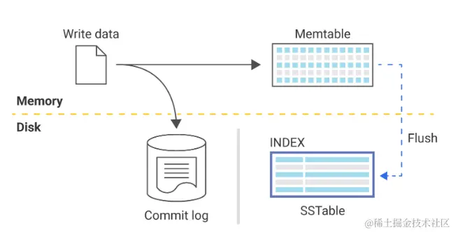 提交日志是一种预写日志,除非服务器崩溃或服务中断,否则永远不会真正读取它。由于内存表存在于内存中,因此它最终会变满。为了释放内存空间,数据库将内存表刷新到磁盘。该过程会产生 SSTable(排序字符串表),这就是数据持久化的方式。