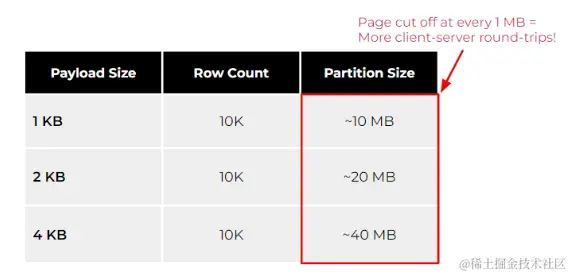 正如您所看到的,在相同的行数下,您的有效负载越高,您的分区就越大。但是,如果您的用例经常需要扫描整个分区,那么请注意数据库有限制以防止无限制的内存消耗。例如,ScyllaDB 每 1MB 就切断页面,以防止系统可能耗尽内存。其他数据库(甚至是关系数据库)也有类似的保护机制,以防止无限的错误查询导致数据库资源匮乏。要使用 ScyllaDB 检索 4KB 的负载大小和 10K 行,您需要检索至少 40 个页面才能使用单个查询扫描分区。乍一看这似乎没什么大不了的。但是,随着时间的推移进行扩展,它可能会影响整体客户端尾部延迟。