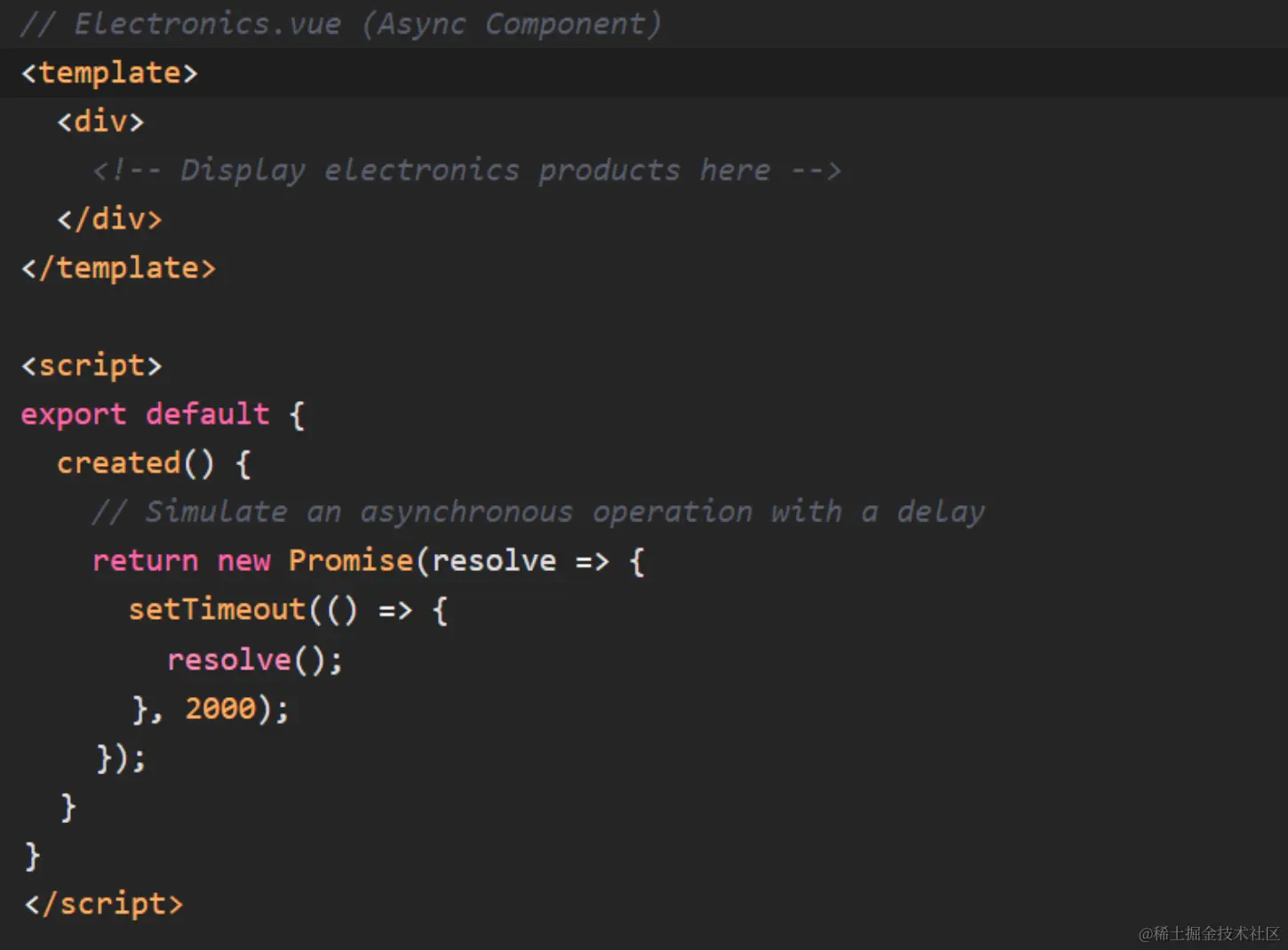 在这个例子中,当一个用户点击了”电子产品”分类,Electronics.vue组件在加载中时, Vue会先显示“Loading Electronics…”