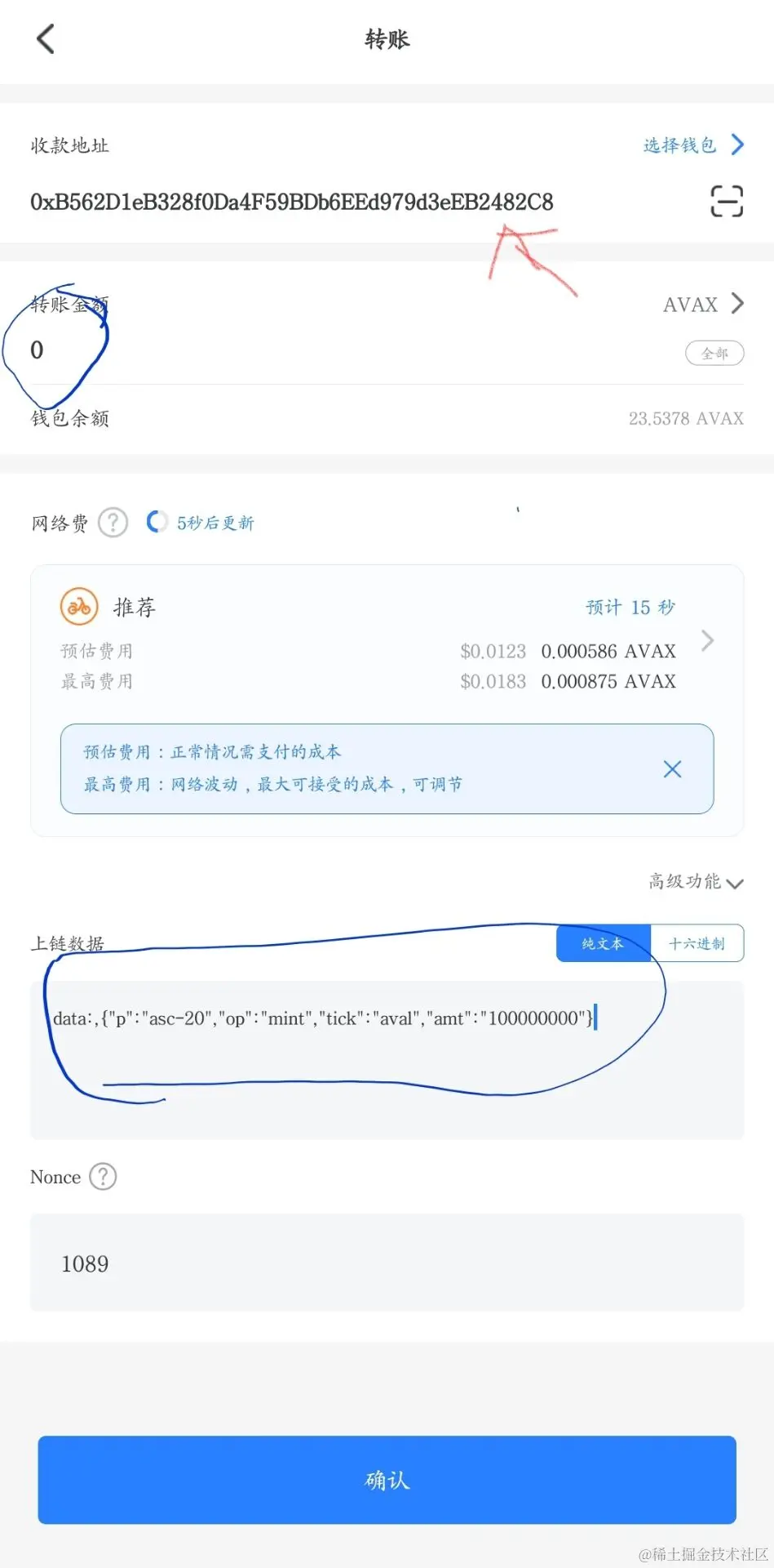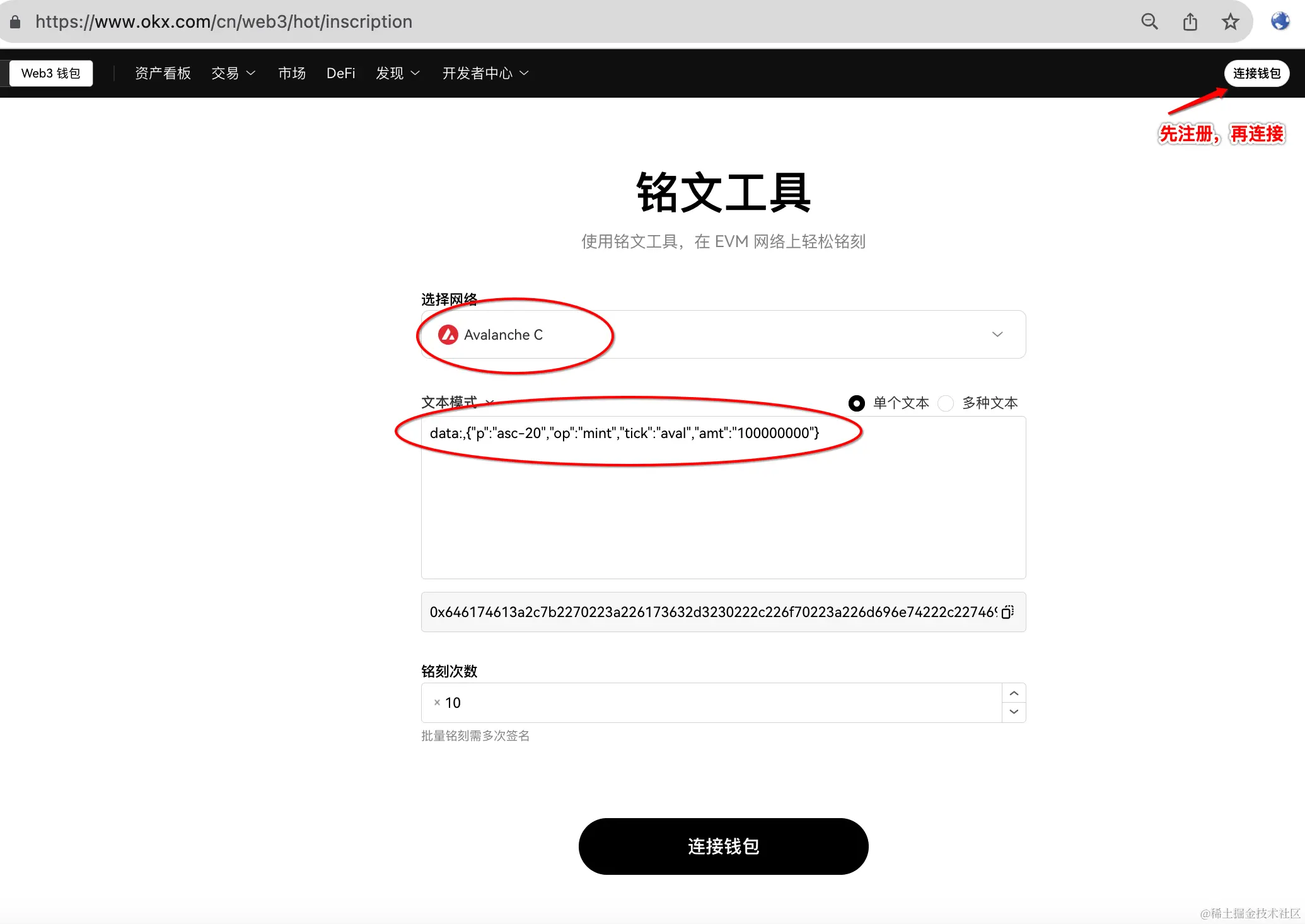 注册后登录APP,点击顶部Web3钱包——接收——搜索”AVAX",点开,复制找到它的地址,从交易所充值avax到这个地址,就可以开始篆刻铭文,篆刻铭文是需要消耗Avax的。