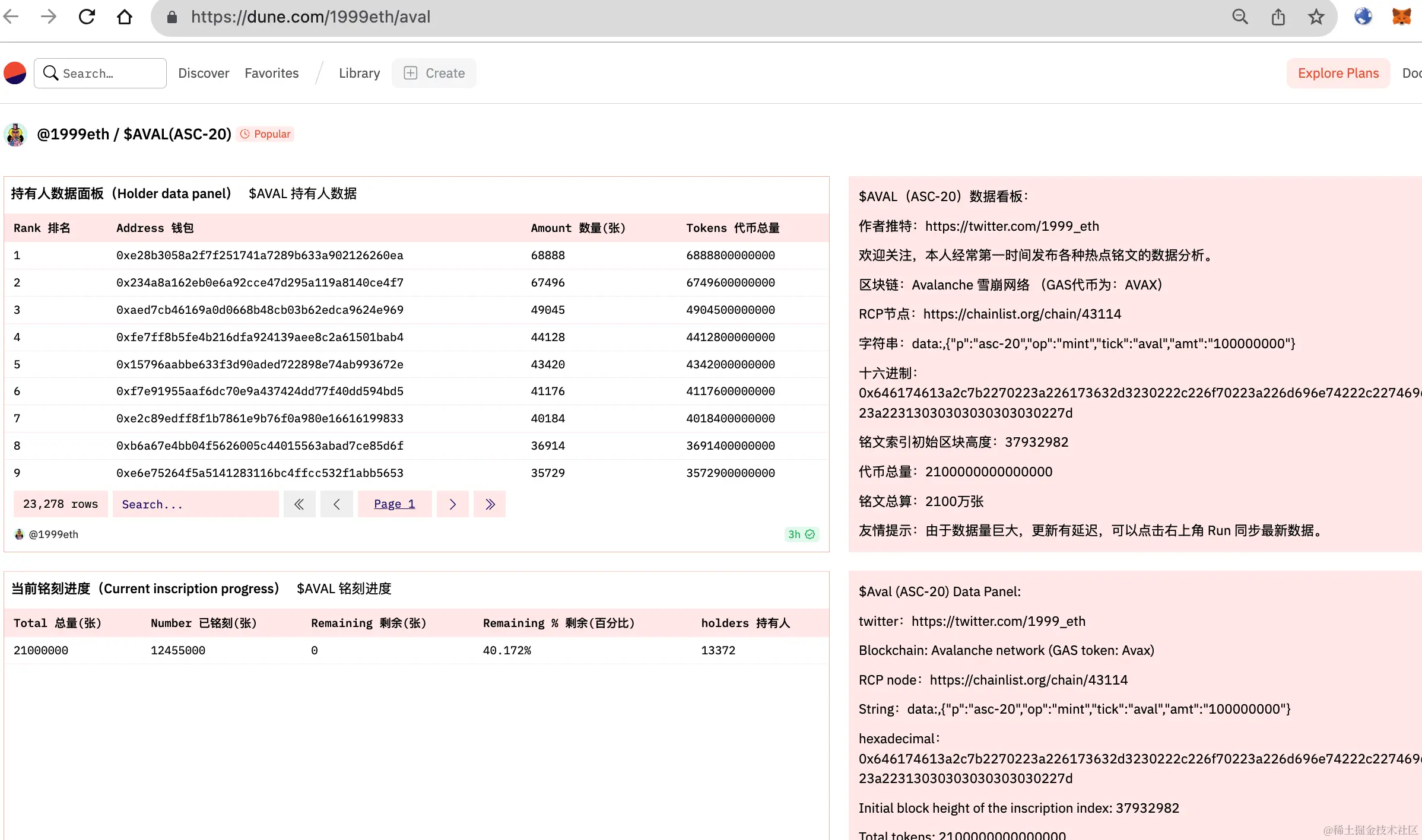 通过社区dune面板可以查看当前铭文打的总体进度,可以输入你的wallet address,查看自己打了多少张。