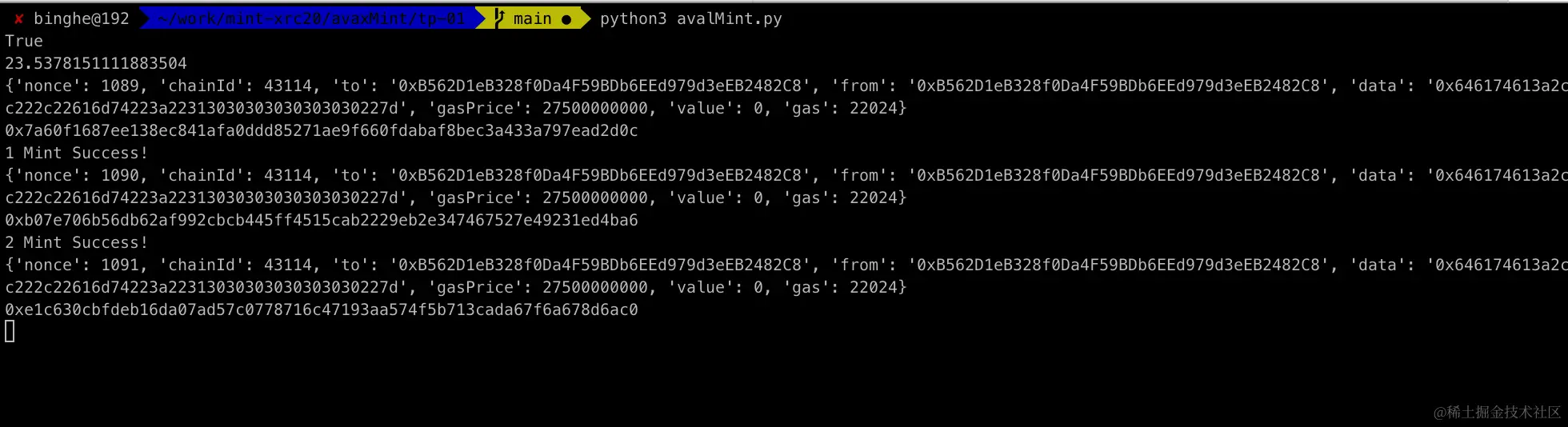 记得先替换程序开头的private_key和address两个为你自己的钱包。钱包申请方法使用文章末尾OKX Web3钱包。然后,打开终端,执行 python3 avalMint.py命令开始打铭文: