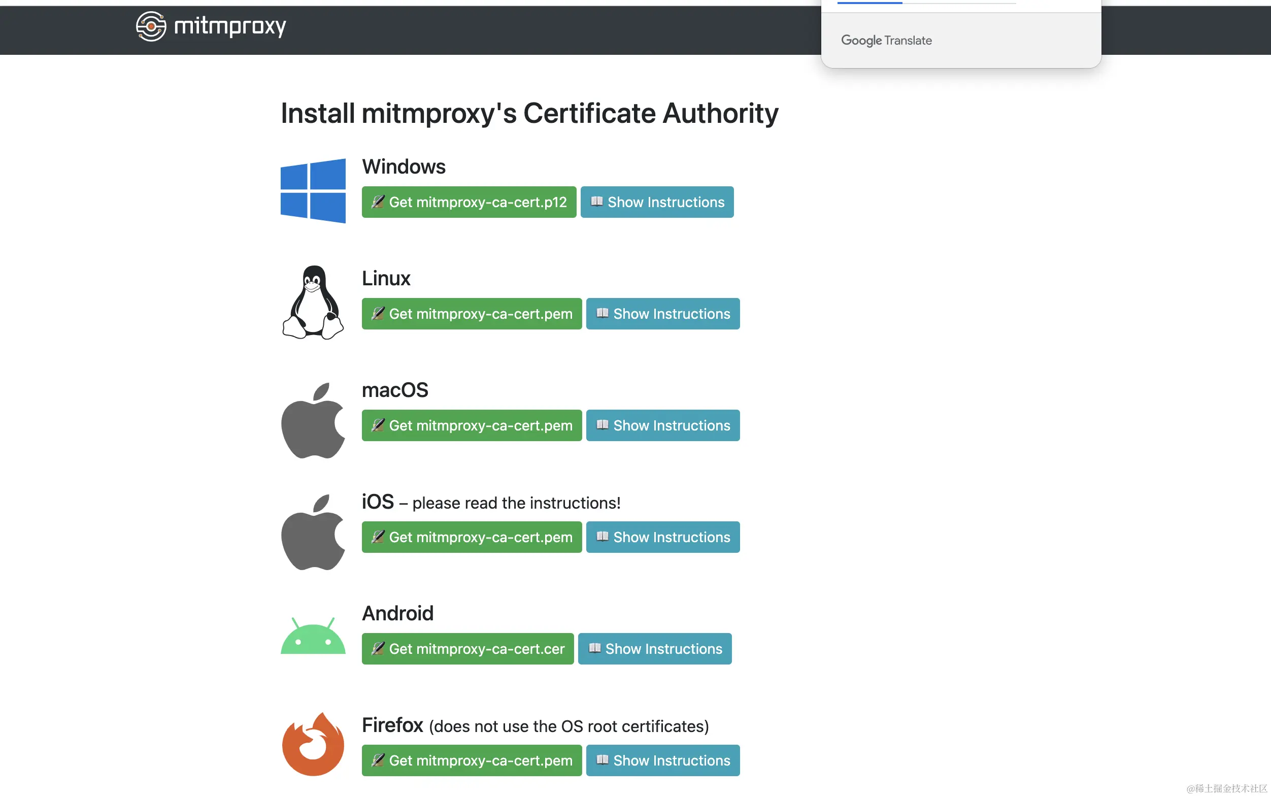 如果出现了以下页面,说明mitmproxy抓到了此http协议包,且返回了其ca证书的下载地址