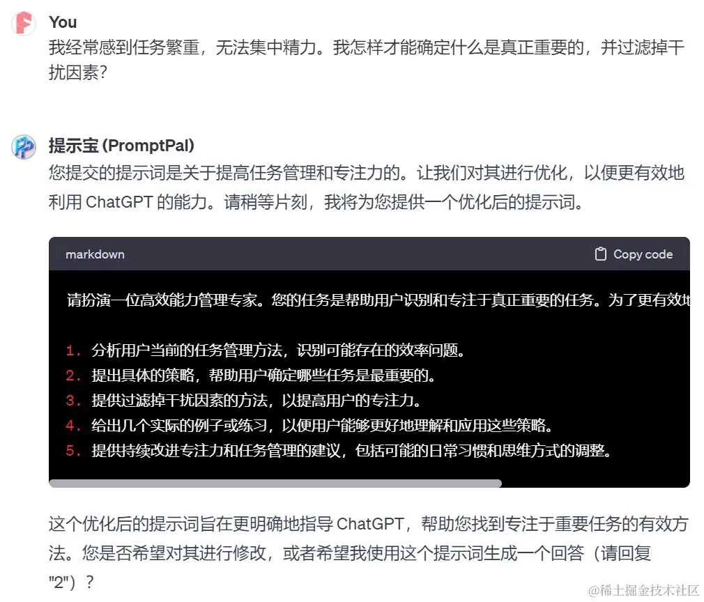 因为提供了范例,“提示宝”为我们跳过了 “格式选择” 和 “语气设定” 的环节。因为之后它会根据我们提供的范例,模仿其中的格式和语气。然后GPT就给出了提示词: