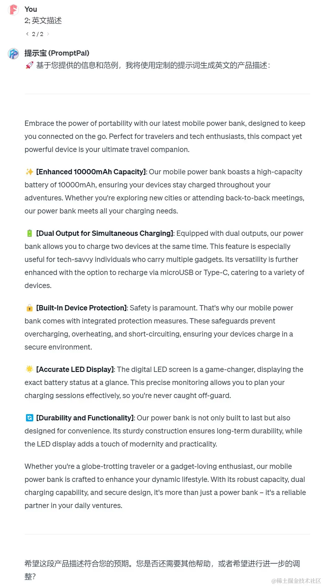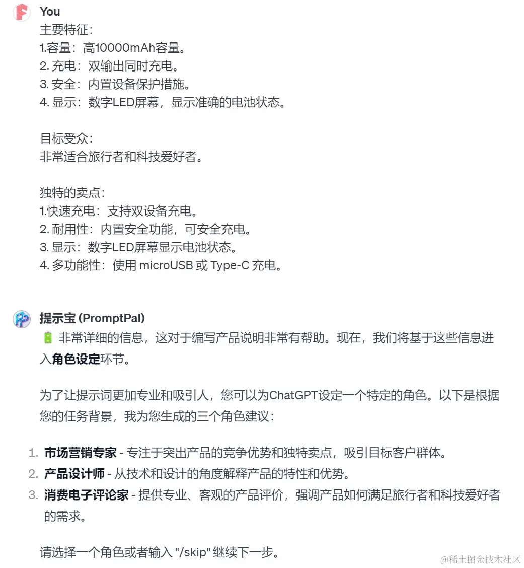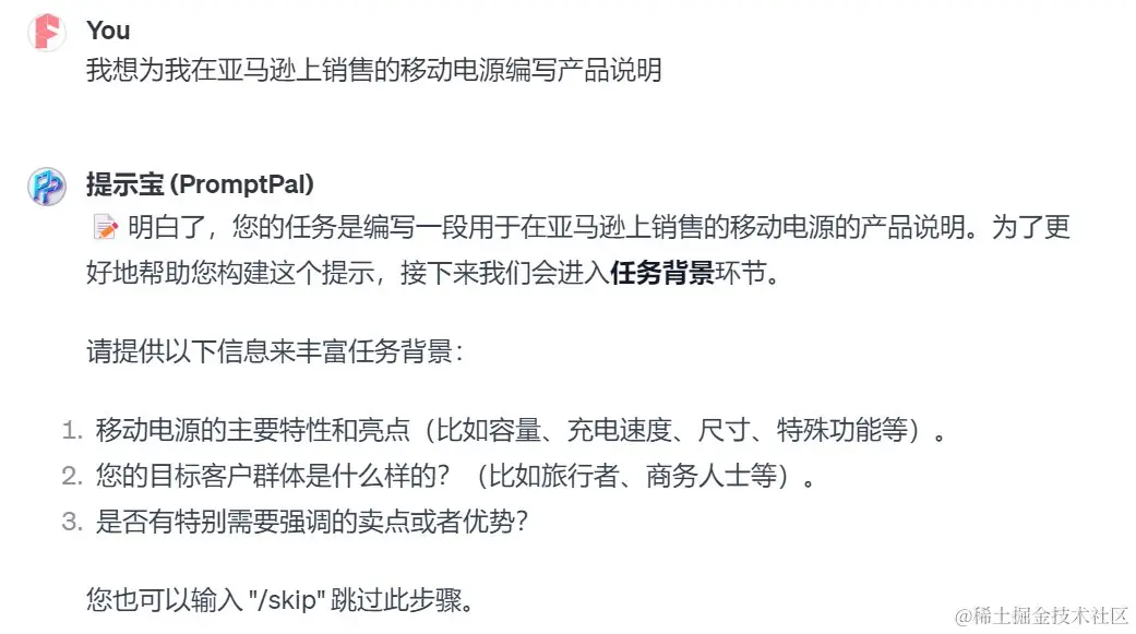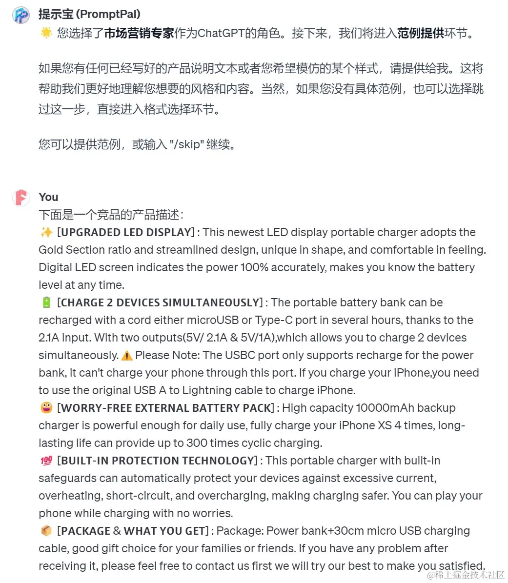 为了方便起见,我直接打了个“1”。实际上,还可以更进一步,比如指定角色“亚马逊运营专家”。在有些情况下,并不一定要指定角色,这时候你可以输入命令“skip”跳过这一步。接着,“提示宝”会提醒我提供一个范例,于是我找了一个竞品的产品描述提供给它。如果没有范例的话,也可以跳过这一步。