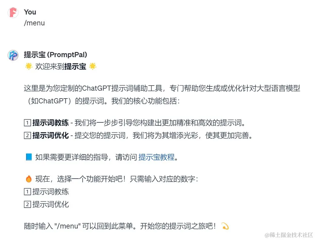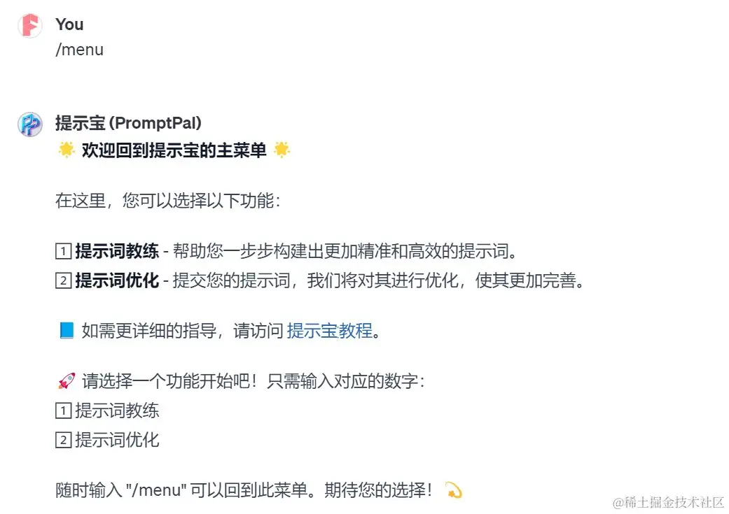 你可以看到非常详细的说明,并且最后还提醒你,在任何时候输入“/menu”这个指令都可以返回主菜单。接着我输入“1”来演示下“提示词教练”的功能。