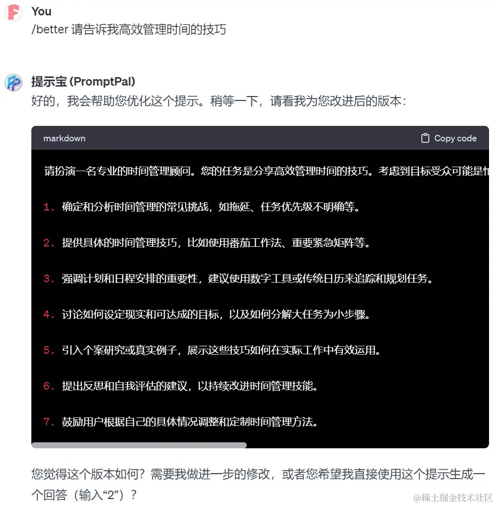 右边的按钮就是一个示例,告诉你可以在被优化提示词的前面加上“/better”这个命令,就可以快速优化现有的提示词。