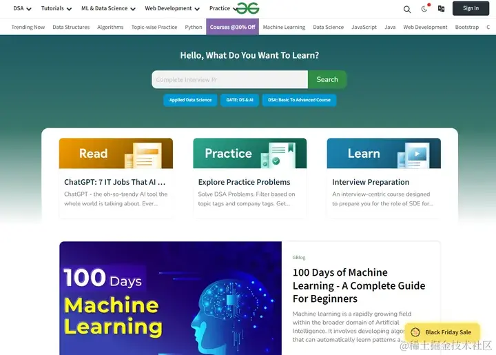 GeeksforGeeks是一个在线开发者学习的网站,站内提供了丰富的学习资源,包括算法和数据结构。该网站提供教程、文章和交互式编码挑战,帮助用户理解和练习这些主题。内容旨在适应所有水平的个人,从初学者到高级开发人员。该网站涵盖了广泛的算法和数据结构,包括排序算法(如冒泡排序、插入排序)。
