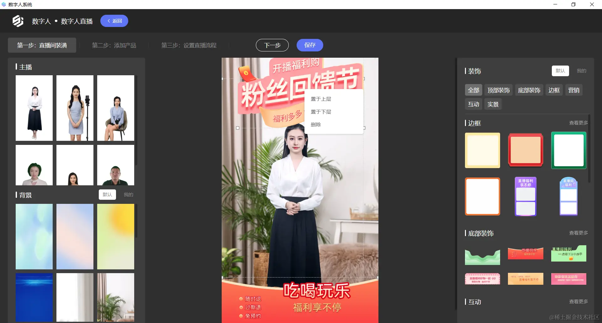 调整主播图层:点击白框内的图片或视频,鼠标右键点击白色控件,点击“置于上层”“置于下层”将主播图片置于最顶部或最底部,点击“删除”将直播图片删除。