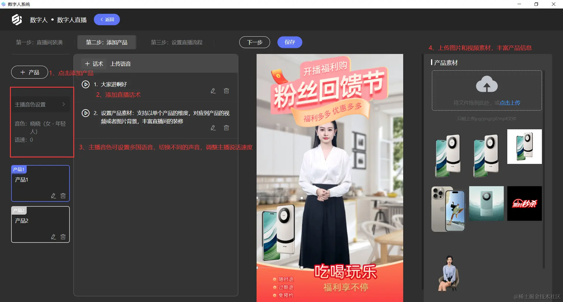 一、添加产品页面分为创建产品、设置主播语言,音色及语速,自定义产品素材这三个功能区域。