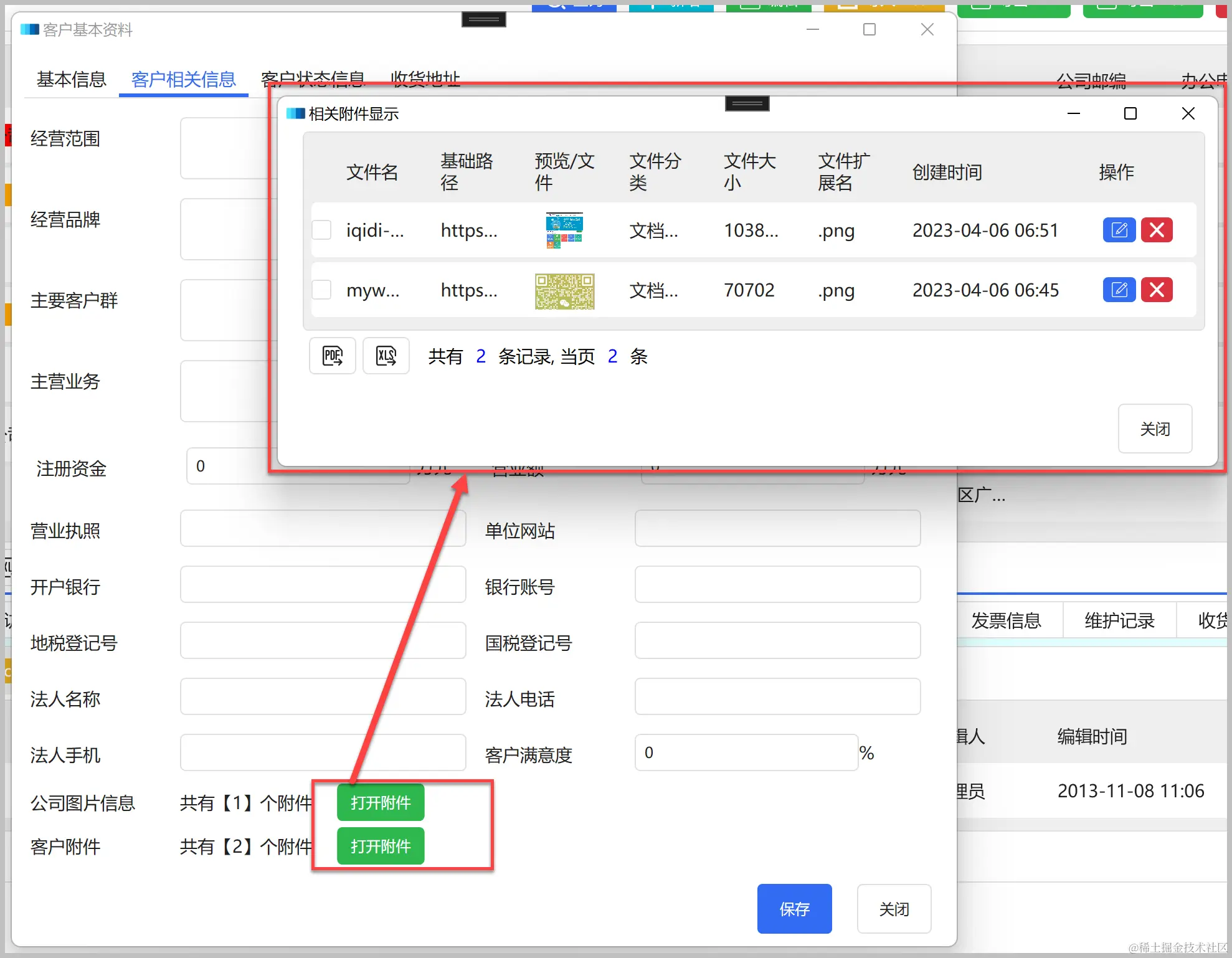 而业务表中的附件列表展示,我们参考Winform端的用户控件设计方式,先展示附件的汇总信息,然后可以查看具体的附件列表,如下界面所示。