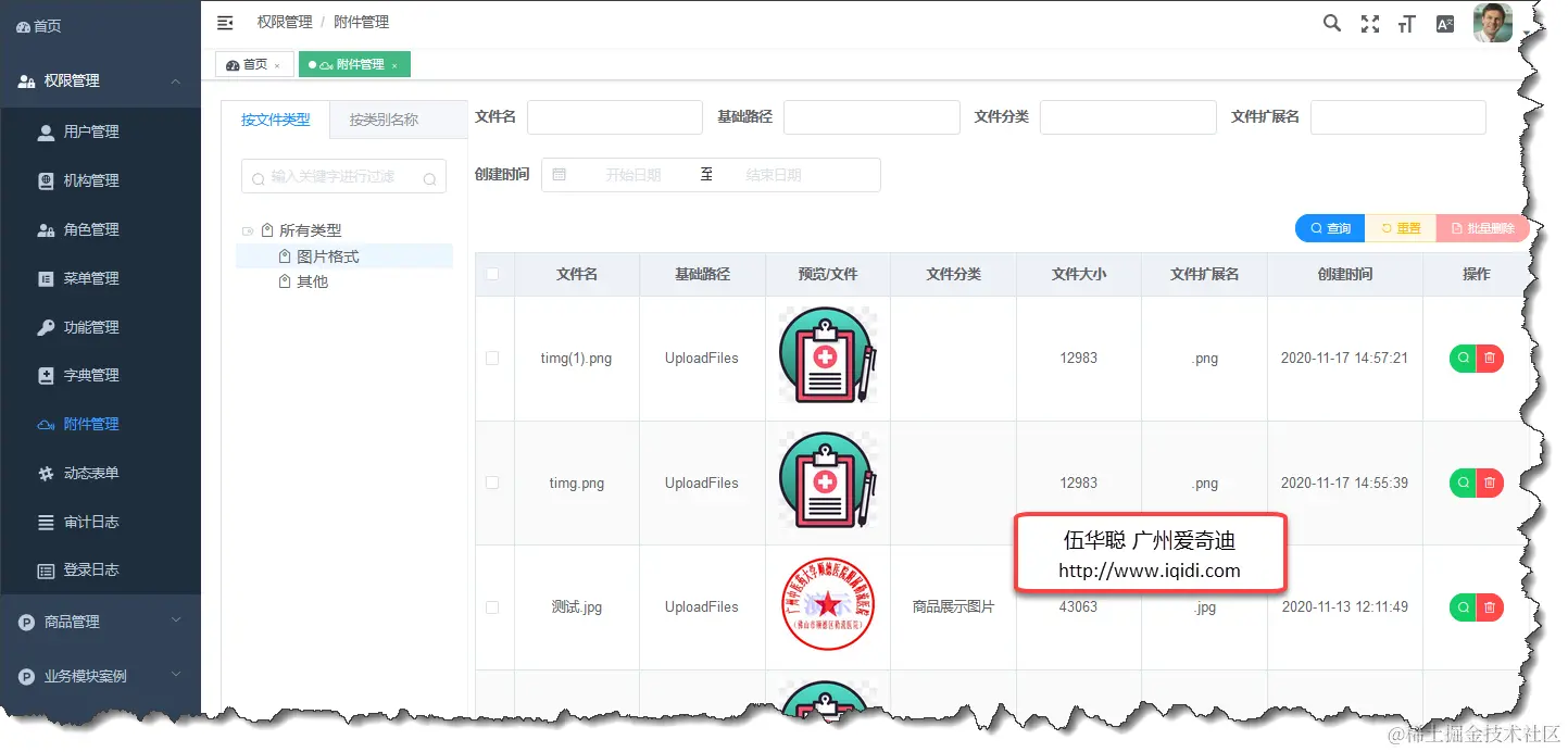 为了管理好这些附件图片等文件信息,我们在前端界面提供一些条件供查询,如下是Vue3+Element Plus的前端管理界面。