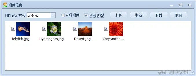 通过以上的界面参考,我们可以借鉴的用于WPF应用端的界面设计中,设计一些自定义组件,用来快速、统一展示附件信息,WPF应用端的附件列表展示界面如下所示。