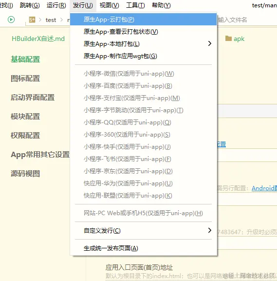 点击菜单栏-发行-云打包,填写包名,选择公共测试证书。