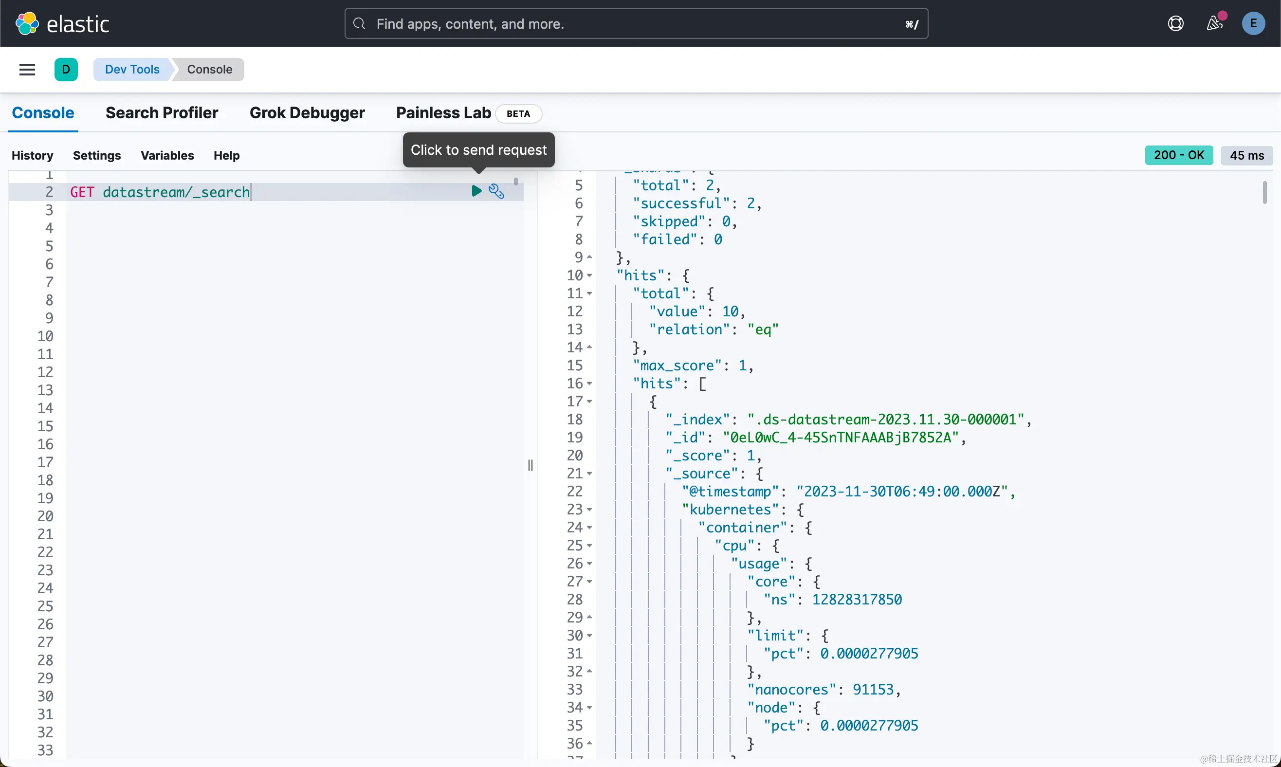 如果你对降采样还不是很熟的话,请阅读之前的文章 “Elasticsearch:对时间序列数据流进行降采样(downsampling)”。这是一个简化的示例,可让你快速了解降采样如何作为 ILM 策略的一部分来减少一组采样指标的存储大小。 该示例使用典型的 Kubernetes 集群监控数据。 要使用 ILM 测试降采样,请执行以下步骤: