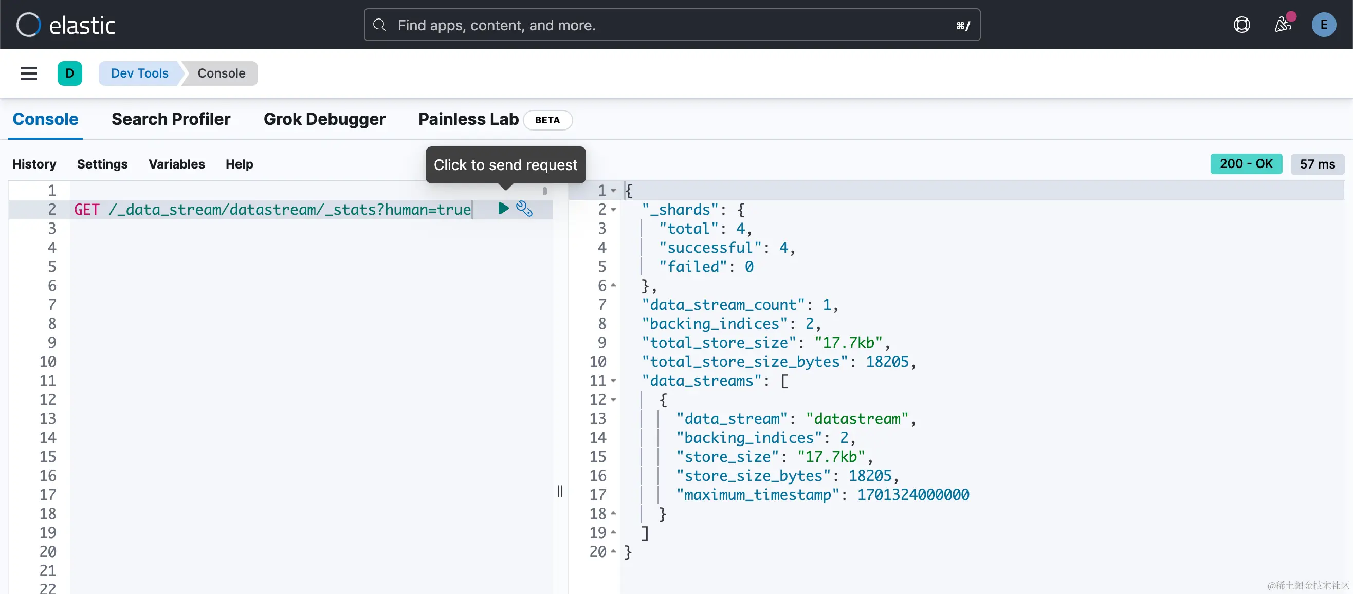 默认情况下,索引生命周期管理每十分钟检查一次是否符合策略标准。 等待大约十分钟(也许可以冲泡一杯咖啡或茶☕),然后重新运行 GET _data_stream 请求。
