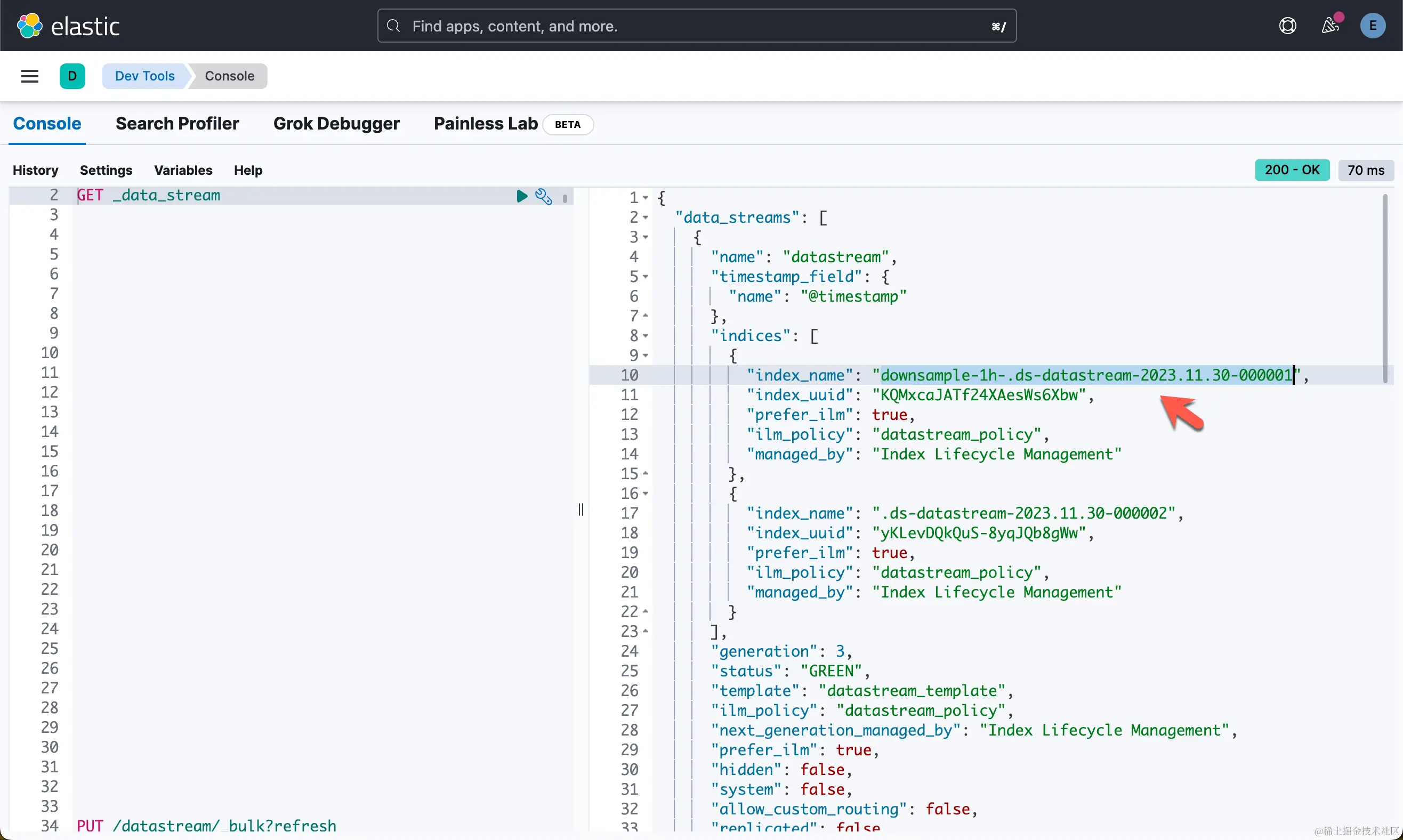 ILM 策略生效后,原始 .ds-datastream-2023.11.30-000001 索引将替换为新的降采样索引,在本例中为 downsample-1h-.ds-datastream-2023.11.30-000001。