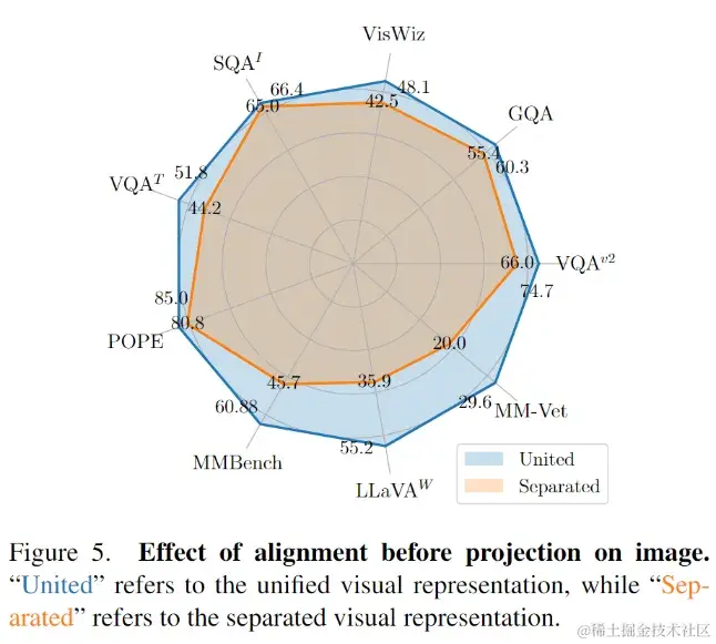 研究结果显示,统一的视觉表示在图片理解方面展现出强大的性能。它在5个图片问答数据集和4个基准工具箱上都明显优于分离的视觉表示。此外,团队还发现,在POPE、MMBench、LLaVA-Bench和MM-Vet这四个基准工具箱上,统一的视觉表示相较于分离的视觉表示有着显著的优势。这凸显了预先对齐视觉表征的好处,它不仅提升了图片问答性能,还在其他图片理解任务中带来了诸如减小幻觉和提升OCR能力等方面的收益。