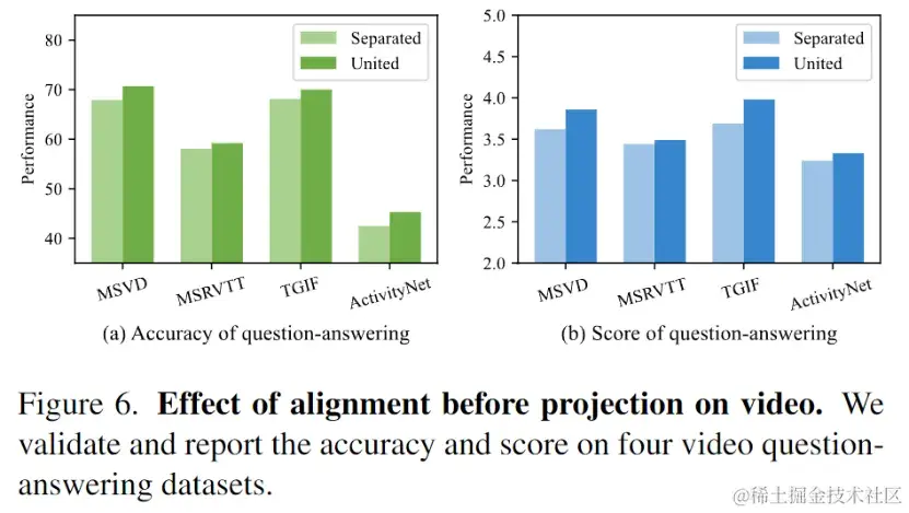 通过替换图片编码器为MAE编码器,LLM在初始学习视觉表示时将视频特征和图片特征分开处理,不再将它们统一起来。有关图6的实验结果显示,与分离的视觉表示相比,联合的视觉表示在4个视频问答数据集上显著提升了性能。这一发现表明,预先对齐的视觉表征有助于LLM进一步学习和理解视频内容。它提供了更好的能力,使得模型能够更有效地处理视频问答任务并展现出更好的性能表现。