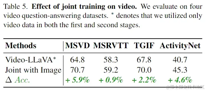 在视频理解方面,我们对4个视频问答数据集进行评估。与仅在视频数据上进行训练的Video-LLaVA模型相比,联合训练图片和视频的模型在这4个数据集上全面取得了更好的表现。这些结果表明,联合训练图片和视频能够促进LLM对视觉表示的理解能力。通过同时学习图片和视频的信息,模型能够更全面地理解和表示视觉内容,从而提高在视频问答任务上的性能。这证实了联合训练图片和视频的益处,对于增强LLM对视觉信息的理解具有积极的影响。