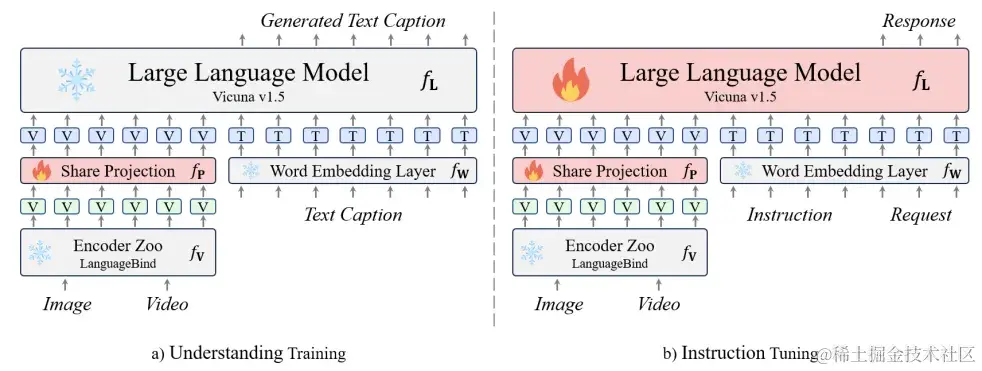 **指令微调阶段:**在这个阶段,收集了来自LLaVA的665k个图像-文本数据集和来自Video-ChatGPT的100k个视频-文本数据集。模型根据不同的指令提供相应的回复。这些指令通常涉及更复杂的视觉理解任务。对话数据包含多个回合,如果涉及多轮对话,输入数据会将之前回合的对话与当前指令连接起来。训练目标与第一阶段相同。在这个阶段,大型语言模型也参与训练。