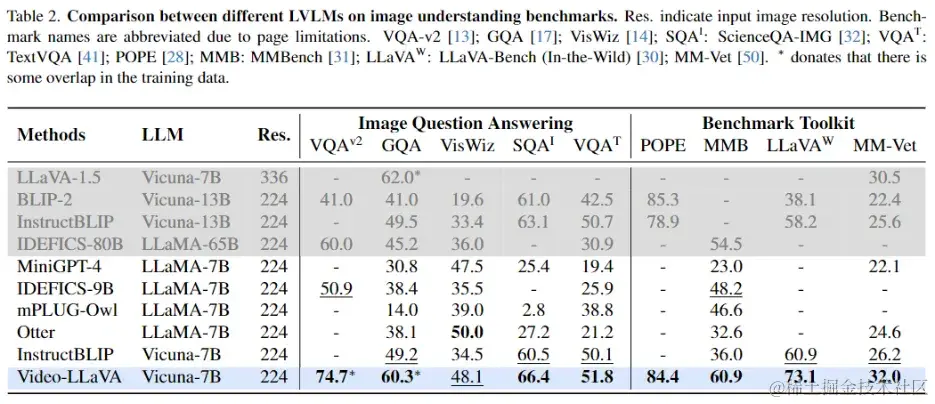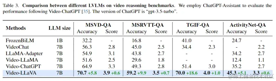 视频理解能力实验 如表3所示,Video-LLaVA在4个视频问答数据集上全面超过了Video-ChatGPT,并且涨幅相当可观。