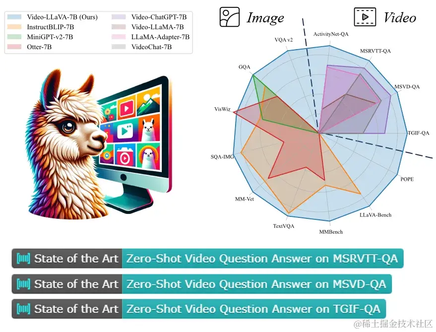 图1 Video-LlaVA在图片,视频上的13个基准上达到先进的性能
