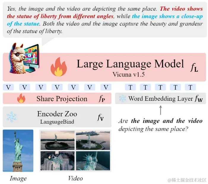 值得注意的是,Video-LLaVA在训练过程中没有使用成对的视频和图片数据,但在训练后,LLM令人惊讶地展现出同时理解图片和视频的能力。如下图所示,Video-LLaVA成功地识别出自由女神像的图片是近景且细腻的,而视频描述了自由女神像的多个角度,表明它们来自同一个地方。