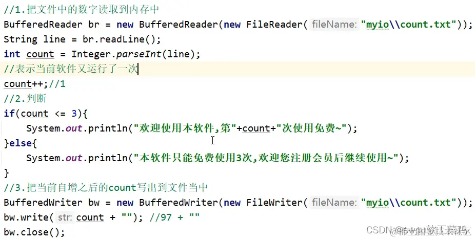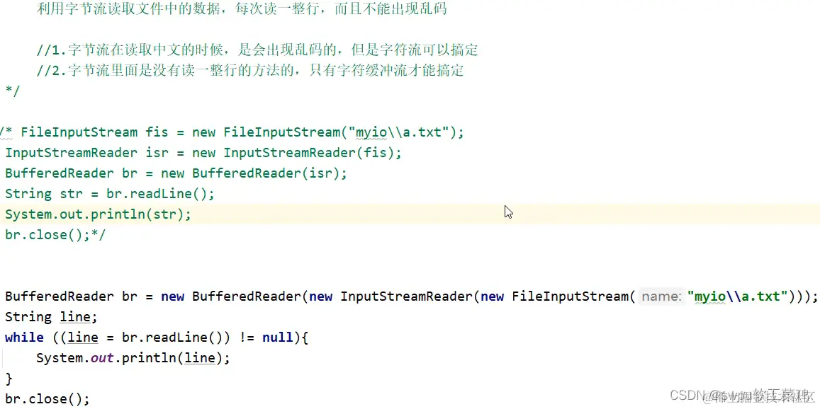 System.out.println(line); //2. 当返回null 时,表示文件读取完毕