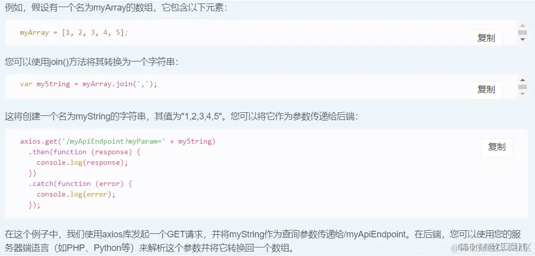 可以使用JavaScript中的数组方法join()将数组转换为字符串,然后将字符串作为参数传递给后端